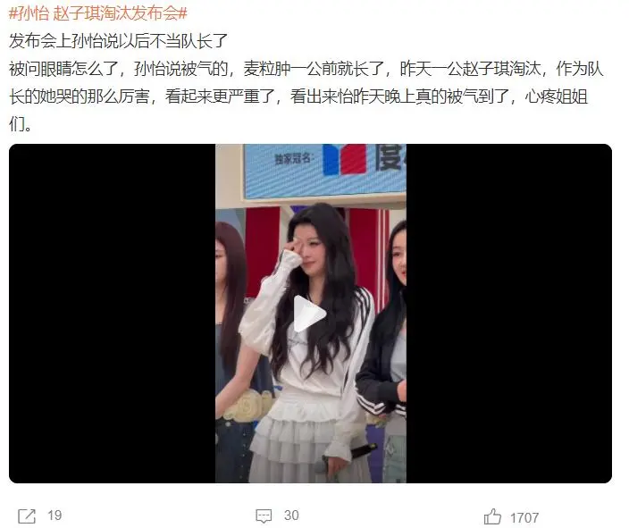 直播开始前,姐姐们接受记者的采访,当时孙怡右眼戴着眼罩,她用调侃的语气说:麦粒肿了,被气的,我们三个有优势吗?但我们尽力了,以后我不当队长了。